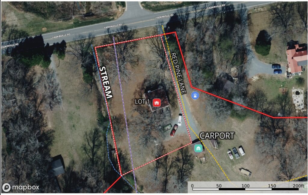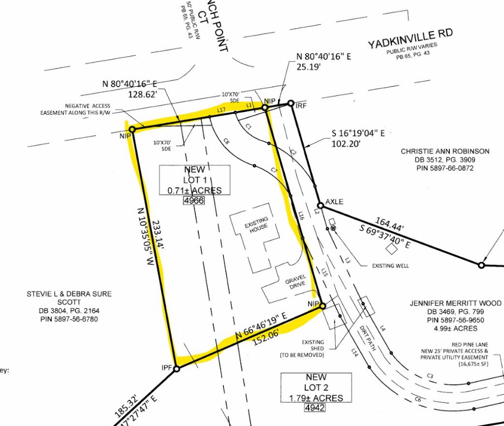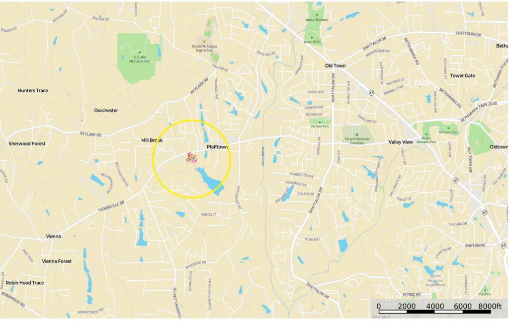 From Grandview Plaza Shopping Center in Pfafftown, NC take Yadkinville Road west 0.6 miles and entrance will be on left. Use interactive map (link above) from your smartphone in order to navigate the lots using your smartphone. You must download the LandID (free) app on your smartphone in order to see yourself on the map