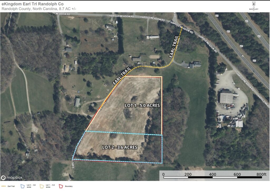 Both lots feature open land and convenient access near US Highway 421. A new boundary survey and subdivision survey are underway and scheduled for completion February 2026. Lot 1 consists of 5.0 acres, and Lot 2 consists of approximately 3.6 acres.