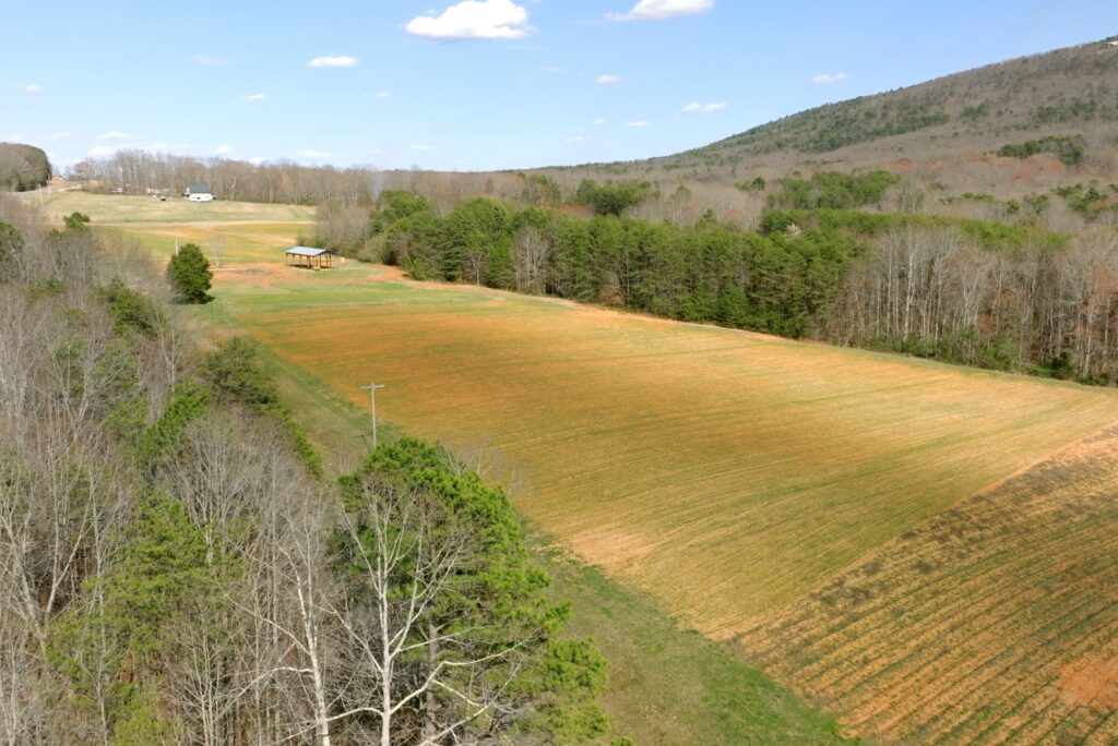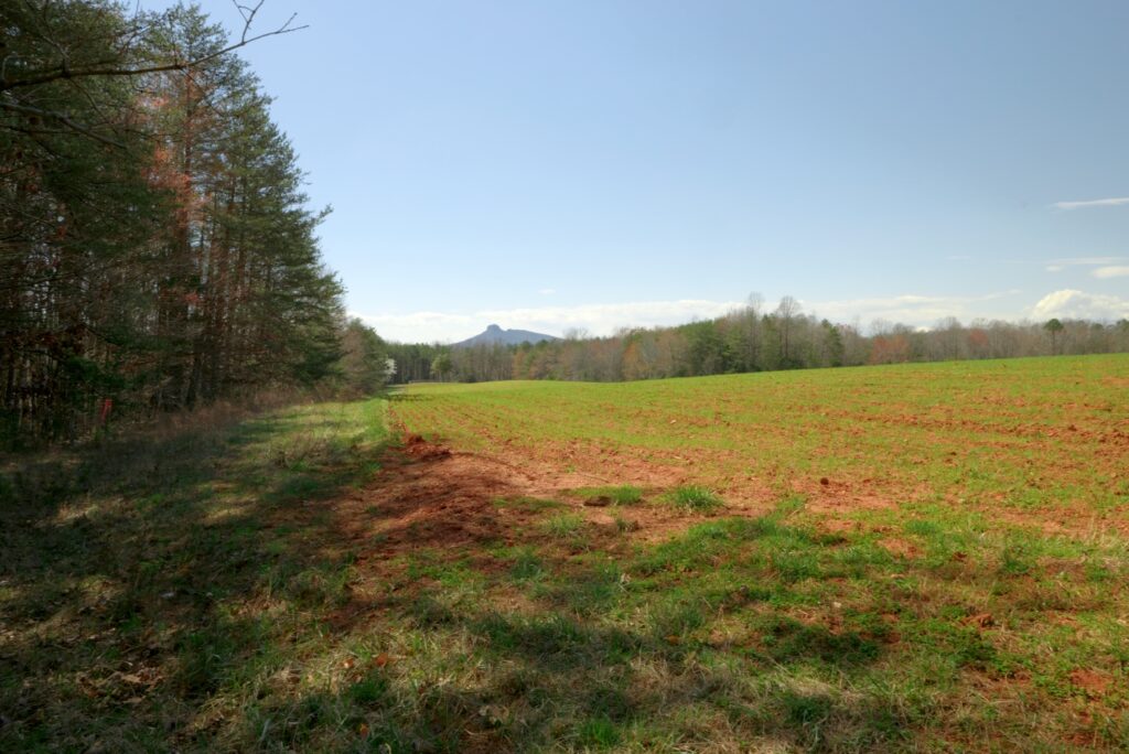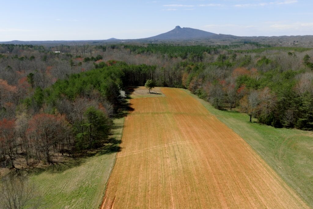 The property features a scenic blend of open crop fields, mid- and mature-aged hardwood and pine forests, gentle rolling topography, long-range Sauratown Mountain views, and water features including creek frontage and ponds on certain lots—ideal for livestock, horses, hobby farming, and recreation.